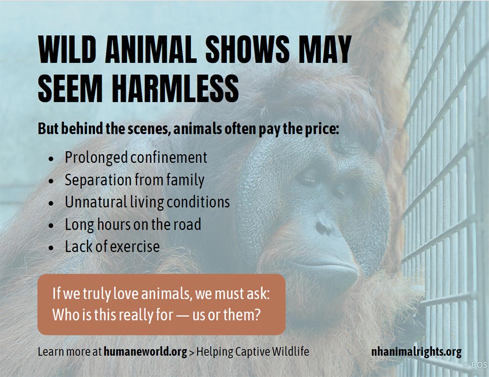 Wild animals shows also glamorize the possession of exotic animals, indirectly promoting the wildlife trade and the idea that wild beings exist for our amusement.