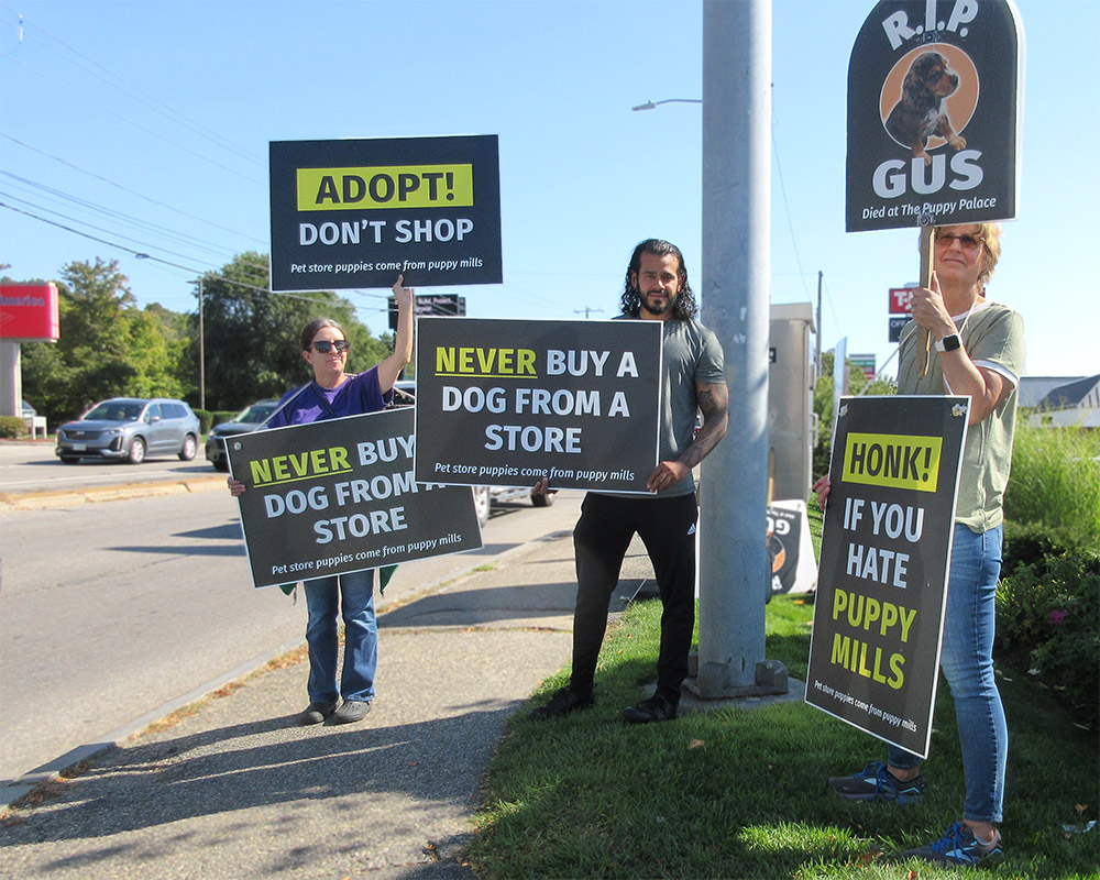 Ever since The Puppy Palace in Manchester, NH opened its doors in May 2023, NHARL has been peacefully protesting the store to warn the public and would-be shoppers about puppy mills and promote “Adopt Don’t Shop.”